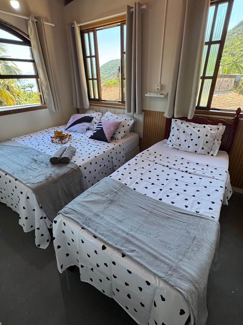 Come and enjoy the beauty of Ilha Grande in the Céu suite. Pleasant, simple and family atmosphere. Space recently renovated for the better comfort of our guests. The Céu suite features a bedroom, kitchen, bathroom and balcony. In the bedroom, there is a double bed and a single bed; a clothesline to hang clothes, air-conditioning, a fan, a 32" LED TV with basic Sky, Netflix, YouTube and other apps. The suite features an equipped kitchen and a balcony with a hammock, dining table and fish tank.