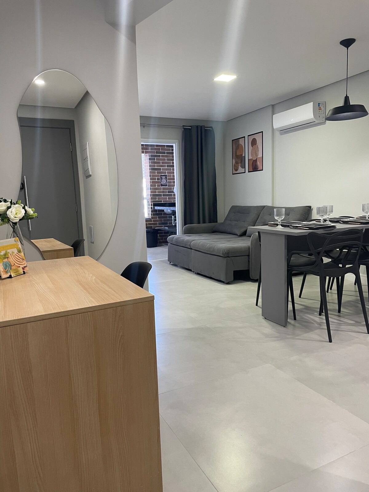 Apartamento completo e aconchegante, ideal para até 4 pessoas, com possibilidade de acomodação extra mediante uso dos colchões adicionais. ✔ 1 vaga de garagem ✔ Wi-Fi ✔ 1 dormitório com cama de casal ✔ 1 sofá-cama de casal ✔ 2 colchões de solteiro ✔ 2 ventiladores de teto e 1 ventilador de chão ✔ Varanda gourmet com churrasqueira ☑️ tv 60 polegadas ⚠️ Importante: As áreas comuns do condomínio (salão de jogos, academia e quadra) não estão disponíveis para uso dos hóspedes.