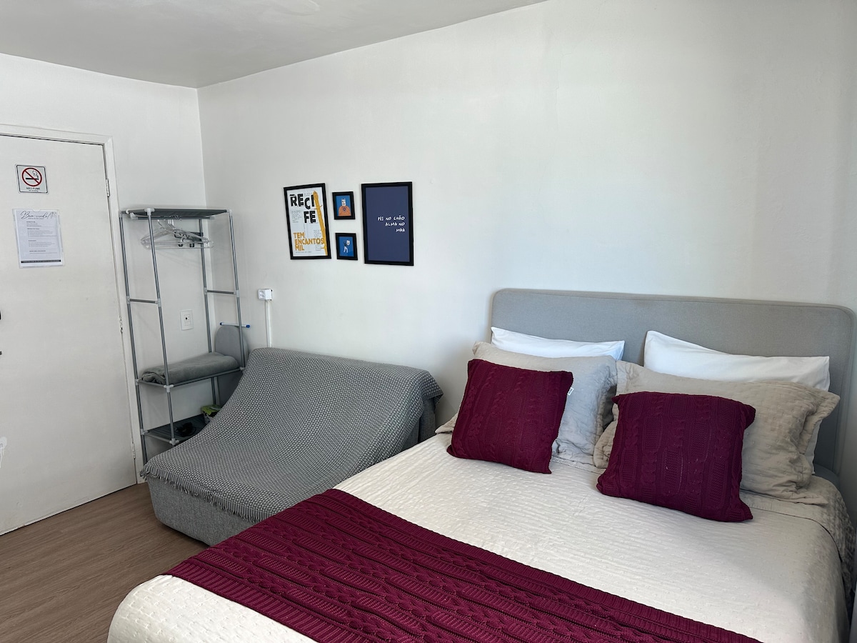 Studio facing the sea, 15 minutes from the airport, old Recife and the Convention Center. Old and traditional building in the most popular and safe spot of Boa Viagem Beach, with Seu Tito restaurant, Alphaiate bar and Borsoi café on the ground floor, 24-hour convenience store and Assaí Supermarket nearby. Ideal for practical and dynamic people, with a good internal structure, kitchen, Wi-Fi, queen bed, air conditioning and a good shower. Third guest accommodated on a comfortable mattress for short stays.
