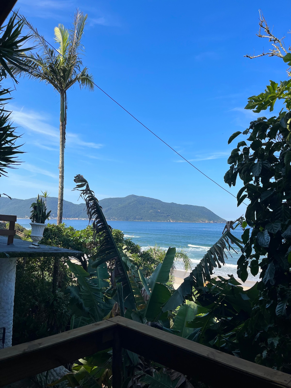 Cabin with direct and exclusive access to the beach, 30 steps to the sand. It has a panoramic view over Pântano do Sul bay, cozy, well decorated and with all comfort in a peaceful environment. Comfortable for 2 adults + 2 in the living room (ideal for children). - Full kitchen, - Air conditioning, - Bed and bath linens, - Barbecue grill, - Beach chairs and umbrella, - Pet friendly, with enclosed garden, - Private gazebo overlooking the beach, - Wifi (400mb).