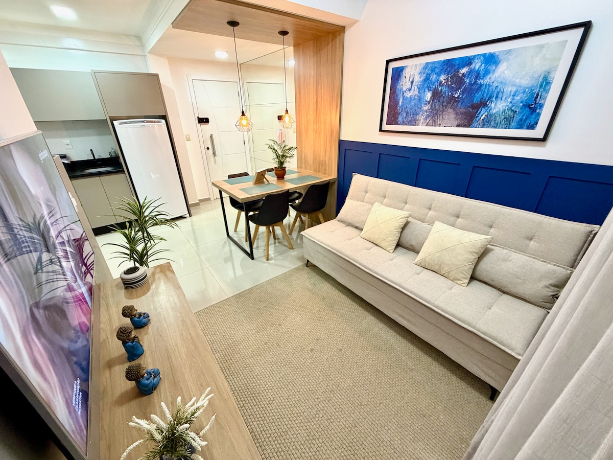 New apartment, new furniture,with 1 bedroom with double bed and air conditioning, 1 bathroom,living room and kitchen combined with sofa bed that holds 1 adult and or 2 children and has windows and balconies with protective screens. Net/clear internet of 250 mega and Net/Clear TV HD Mix.Intelbras electronic lock. Garage space that supports small and medium-sized cars. I do not accept large cars,in the doubt please see.