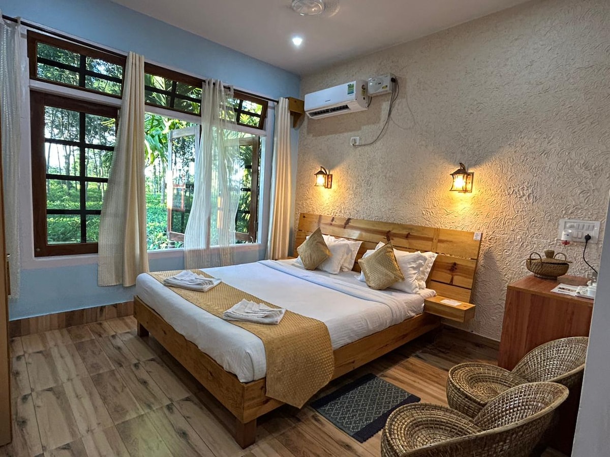 Family Room with Lake View - The Tea Garden View Cottages at Kanoka encapsulates the timeless allure of the village, with modern-day luxuries. Wake up to the aromatic scent of fresh tea leaves, enjoy a hand-brewed cup on your private porch, and watch as the gardens come alive with nature's dance. This cottage is a haven for tea lovers, nature enthusiasts, and anyone seeking solace in the lap of nature