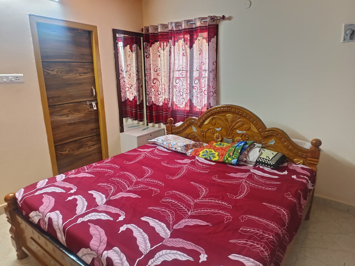 This entire 2 BHK first floor house for a comfortable stay upto 8 Member family. All basic amenties are available including Gas stove, Utensils and Fridge is available for a simple home stay. Out of 2 bedrooms , only one bed room has Geyser and AC. However both bedrooms have attached bathrooms and 5*6 size cots. bedsheets and Toiletries need to be brought by Guests. There is charging point for EV vehicles This is a quiet and secluded place away from city hustle and yet just 3 KM from center
