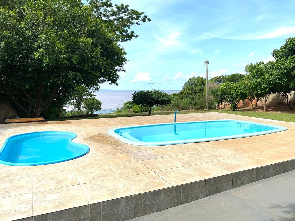 Facing the Paraná River, in Pres. Epitácio. We are located in a gated residential complex with a beautiful beach in front of the house. It has an upper deck with a view of the river and the sunset, which has been voted "The most beautiful in Brazil". Three bedrooms, two of which are en-suites (all with air-conditioning), a guest bathroom, and a bathroom in the pool area. 6X3 swimming pool (optional heating from Oct to March) Close to excellent options for renting boats for fishing. 16 minutes from Pres. Epitácio. ranchoalemdohorizonte