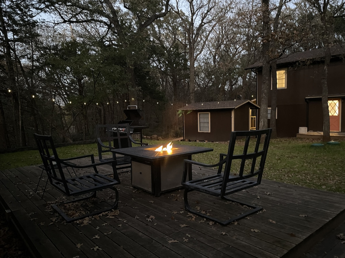 Escape to our cozy A-Frame cabin, a peaceful, wooded retreat perfect for your next getaway. We designed the cabin for easy relaxation—from the rocking chairs on the deck to the fire pit ready for evening chats. The kitchen is fully equipped and the grill is ready to go. You'll love the comfy king bed and the chance to spot owls from the 2nd bedroom! An easy 1-1.5 hour drive from Dallas and minutes from Lake Texoma, Highport Marina & Tanglewood Resort - it’s the perfect place to relax & recharge.