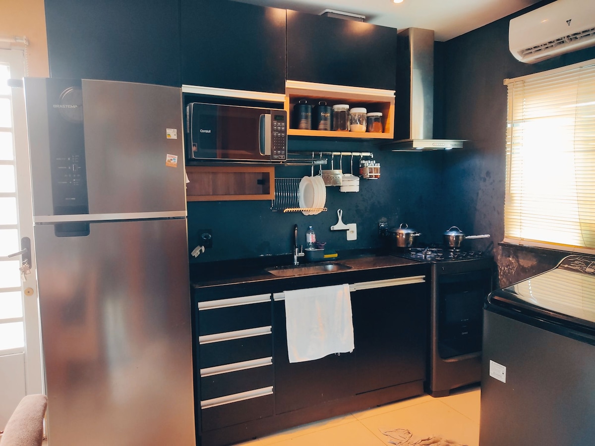 Comfortable and reserved Kitnet. It is separate from the main house, allowing you to come and go as you please. It has a bedroom with a double bed, a bathroom and a kitchen/living room. Microwave, stove without oven, minibar and coffee maker. We provide sheets, pillows, towels and toilet paper. No electric shower at the moment and dogs or cats are not allowed