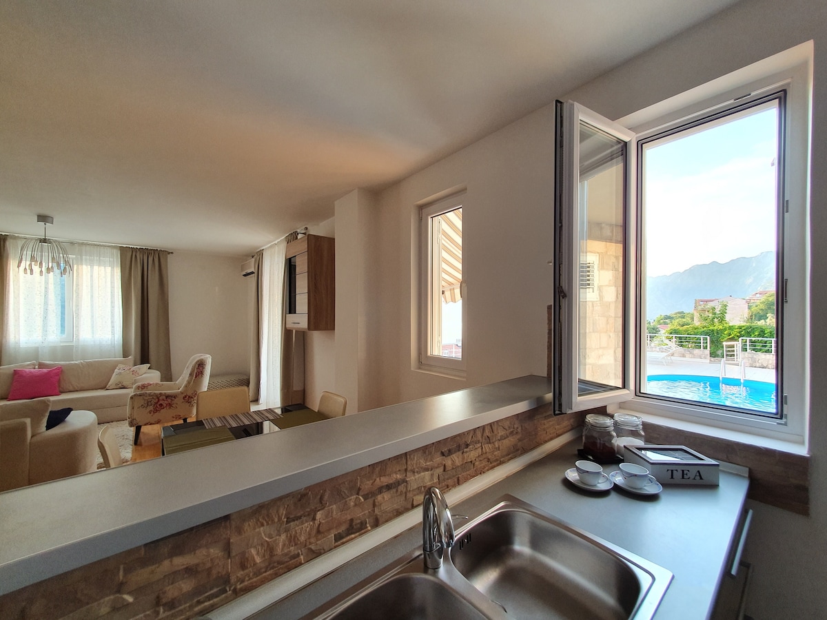 Apartments in a premium residential complex on the bay of Boka Kotor Fjord - Ideal location for both short and long family vacations - The largest swimming pool in the Bay of Kotor area - Private garden 90 m2 with BBQ&grill and several areas for outdoor dining and relaxing - Private parking for 2 cars a few steps from the door - Several beaches within walking distance - Numerous restaurants, incl. Stari Mlini - 7 km to Kotor - 4 km to Perast - 15 km to Tivat Airport - 45 km to Dubrovnik Airport