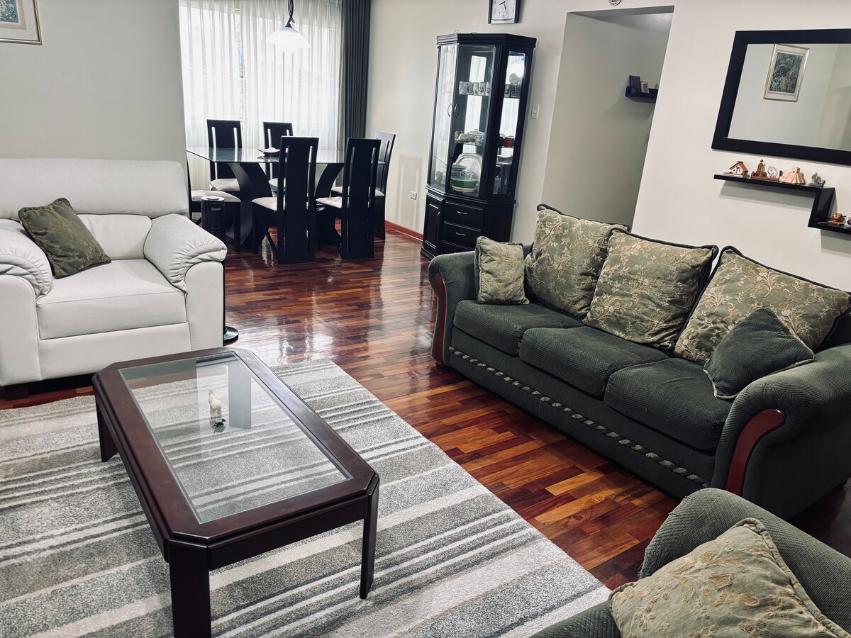 Acogedor departamento ideal para familias pequeñas. Ubicado en una zona segura. Cuenta con habitación privada con TV, baño personal y ropero. Cocina equipada con minibar, cocina a gas, lavadora y barra para comer. Comedor pequeño con ventana y TV adicional. Incluye cama plegable para un tercer huésped. Buena ventilación con dos extractores de aire, con agua caliente, WiFi, TV cable y área de parrilla junto a un jardín ideal para comidas al aire libre. ¡Reserva ahora y vive una escapada perfecta!