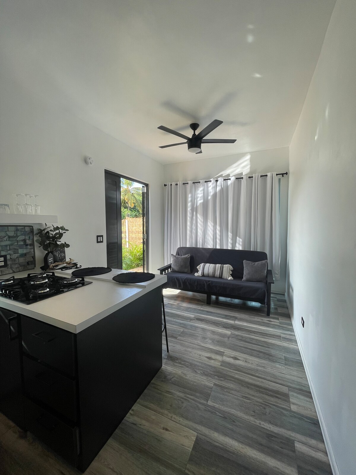 This homey vacation rental is a brand new construction and is a great place to enjoy the outdoors. The interiors feature a modern design, a full kitchen, full bathroom, outdoor shower, and sleeps 3 people. Listen to the sound of the coquis at night and enjoy the tropical breve e, relaxing in the beautiful plunge pool or grilling on the outdoor deck, surrounded by lush palms, fruit trees (breadfruit, lemons, bananas, plantains, cashews), and herbs (mint, sweet peppers, oregano).