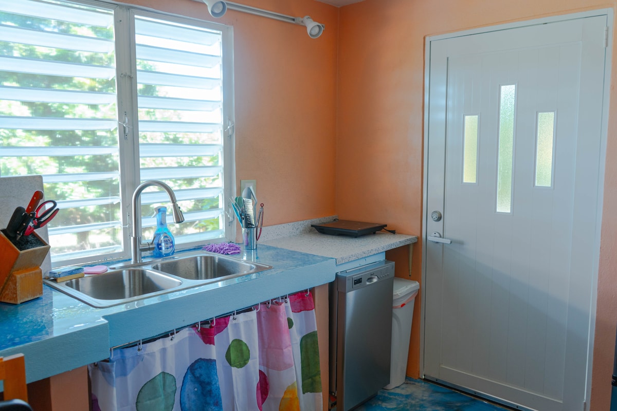 Enjoy the private downstairs apartment in our two-story house. It features a full open kitchen, indoor and outdoor dining spaces, a queen bed in the bedroom with AC, a sofa that pulls out to become a second bed, and a shower with hot water. There is smart TV. The entrance is private and parking is right in front of the apartment. It's located in Villa Borinquen, a 5 minute drive or 25 minute walk from the ferry station and surf breaks.