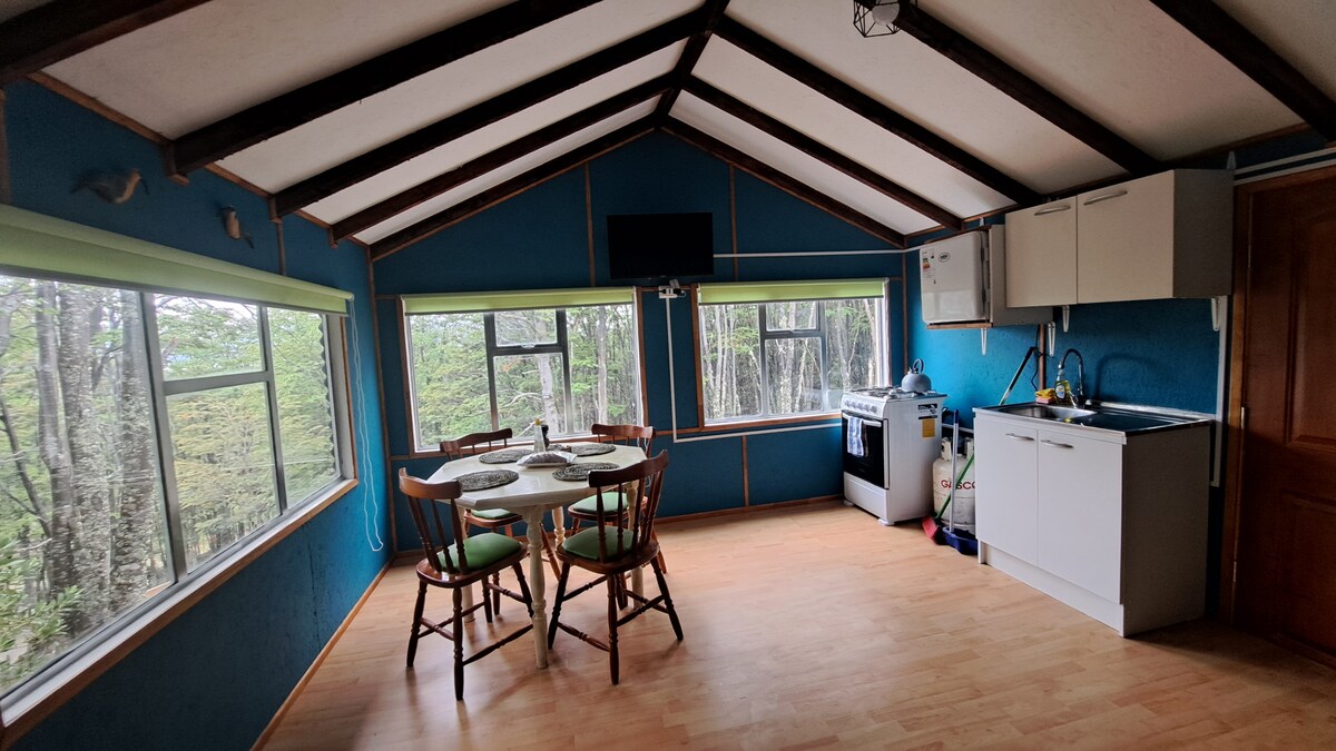 Mountain cottage, located at the beginning of the trekking Dentes de Navarino in the middle of the forest of lenga and Cohigues. Ideal for resting and surrounded by tranquility. Located just 10 minutes from the city center by car, 30 minutes walking, heating with wood-burning stove to relax after trekking. Ideal for adventurers.
