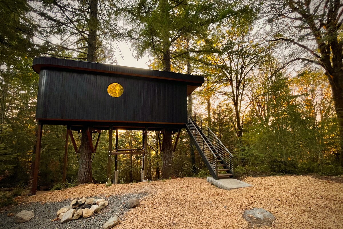 Featured on Treehouse Masters, this magical retreat was built by Pete Nelson in 2017. The glowing wood interior and windows extend from floor to soaring ceiling inside this cozy yet luxurious treehouse. Tucked away on thirty forested acres, the airy interior is comfortably furnished and bursting with natural light. Equipped with an outdoor hot shower, Wi-Fi, a 100 inch screen/projector, and hot tub, you can truly get away from it all among lush evergreens just 10 minutes from Redmond.
