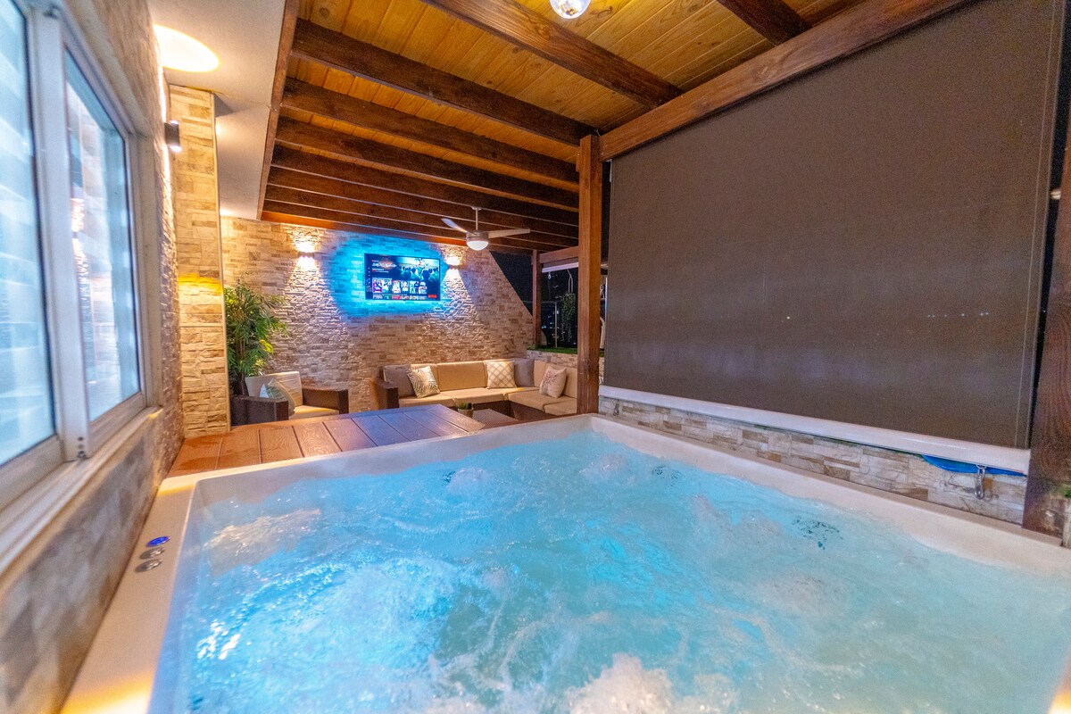Experience the ultimate blend of style and privacy. What you’ll love: • Private Jacuzzi: Large, modern, and just for you. • Outdoor Living: Terrace with rattan furniture, BBQ, and lush decor. • Luxury Interior: 75" Smart TV, AC, and designer finishes. • Kitchen & Bar: Sleek space with a full cocktail bar setup. • Premium Bath: Ultra-modern dark textures and rainfall shower. Perfect for romantic getaways or elite travelers. Book now!