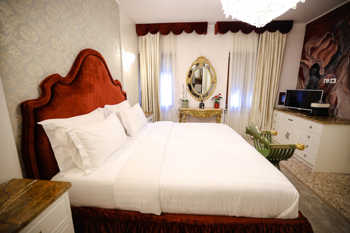 AMETISTA Suite is a 70sqm of show! Located on the second floor and overlooking the Grand Canal of the Murano island, 5 windows and a balcony, a real Suite with unique brightness and incredible view. Restored in 2017 with latest generation lights, independent heating, Wi-Fi and air conditioning, a splendid bathroom of engraved marble decorated by hand with gold and silver leaves, it is a simply idyllic property.