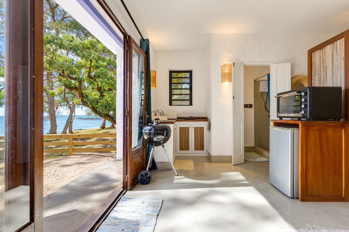 The studio is situated directly on the beautiful beach of Trou d'Eau Douce, directly facing the turquoise lagoon. This is not a luxury studio, it is an authentic and charming beach space where you feel connected to the beautiful nature of the east coast of Mauritius. It is ideal for a couple and includes a double bed, a kitchenette, a walk-in closet and a bathroom. It’s large front glass door gives you a direct view and access to the lagoon.