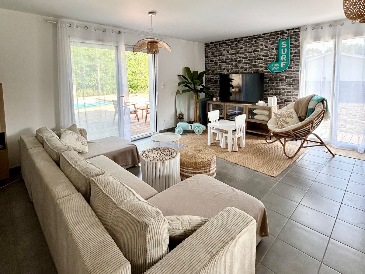 Mediterranean-style family cocoon, nestled in the heart of the vineyards between the Gironde estuary and the ocean (20 minutes away). This unusual place bathed in light is a perfect base for exploring the Médoc. It will be easy to enjoy the vineyards, the surrounding wild beaches, and the waves for surfers looking for tranquility. The house lends itself to relaxation with its pool and "slow life" atmosphere.