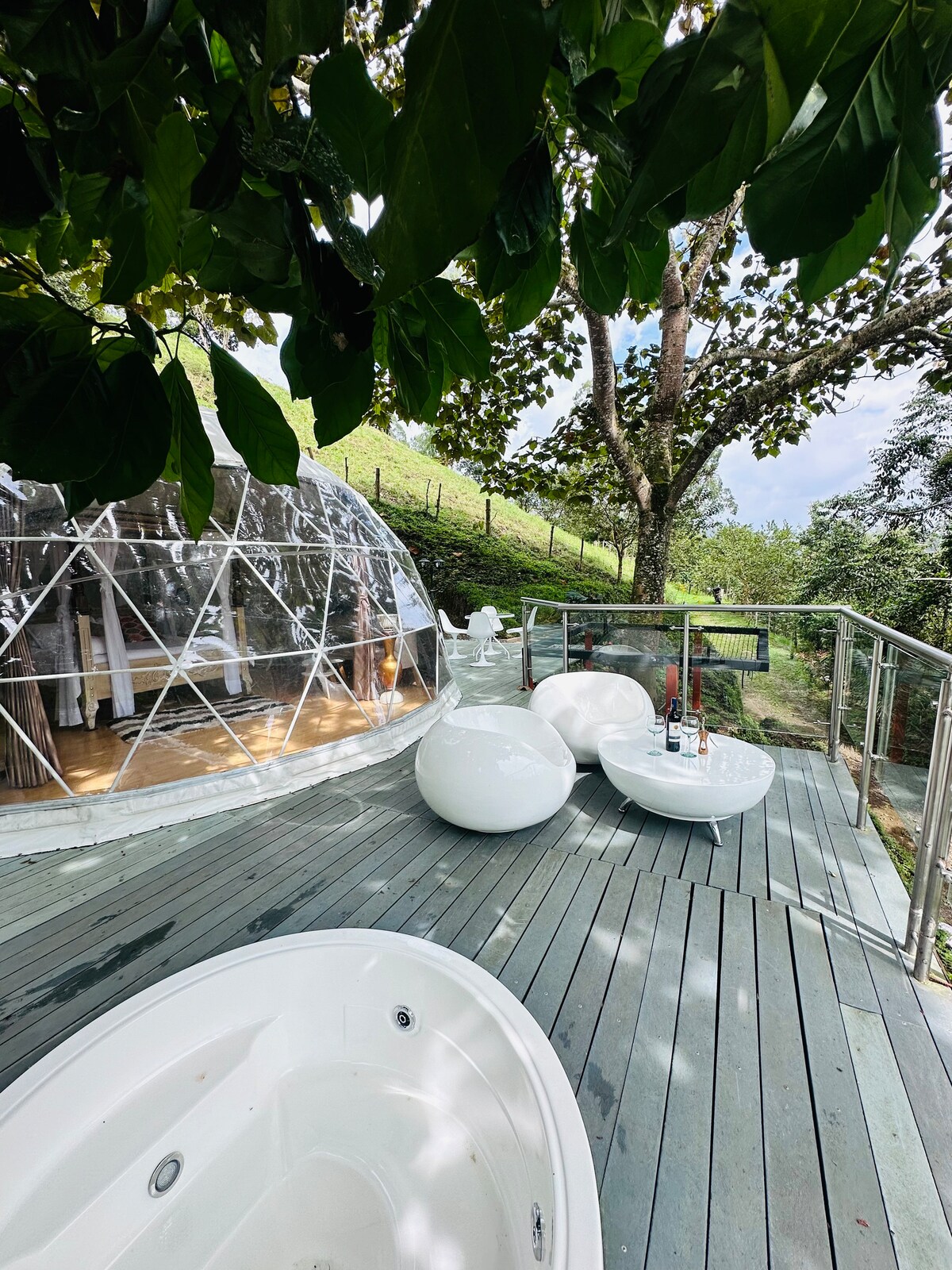 ✨ Glamping Dome in the heart of Quindío✨ -King size bed - Ambient light - 100" projector - Mini bar - A living room - Blackouts - Terrace - catamaran mesh - Jacuzzi with hydromassage and waterfall - Panoramic view bathroom - Includes breakfast Advantages - Roadside - Restaurant - Swimming pool - Magical trails - Waterfalls - Wi-Fi area - Parking - Near Barcelona Quindío, Buena Vista, Pijao - Near Recuca, Panaca and Parque del Café tourist parks