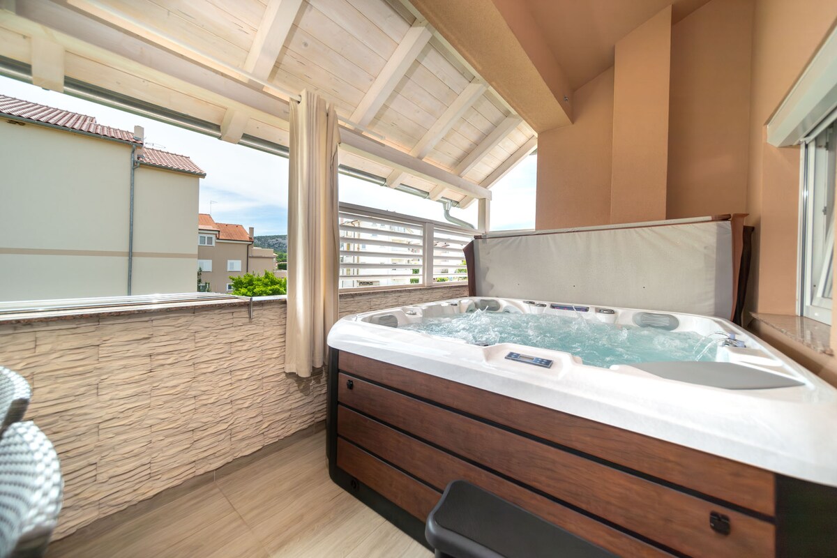 Explore Old Town Krk and attractions within minutes. 5-star Platinum Apartment 4 for 6 guests with 3 king-size bedrooms and 3 bathrooms. With 2 private terraces, a living room and kitchen, HOT TUB and INFRA RED SAUNA. PARKING spot for 2 cars provided inside Old Town walls! Centrally located in Old Town Krk, 200m from the beach, with nearby restaurants, shops, wine tasting, and historic charm. All needed amenities are provided including WiFi and Netflix. Modern design for a peaceful escape.