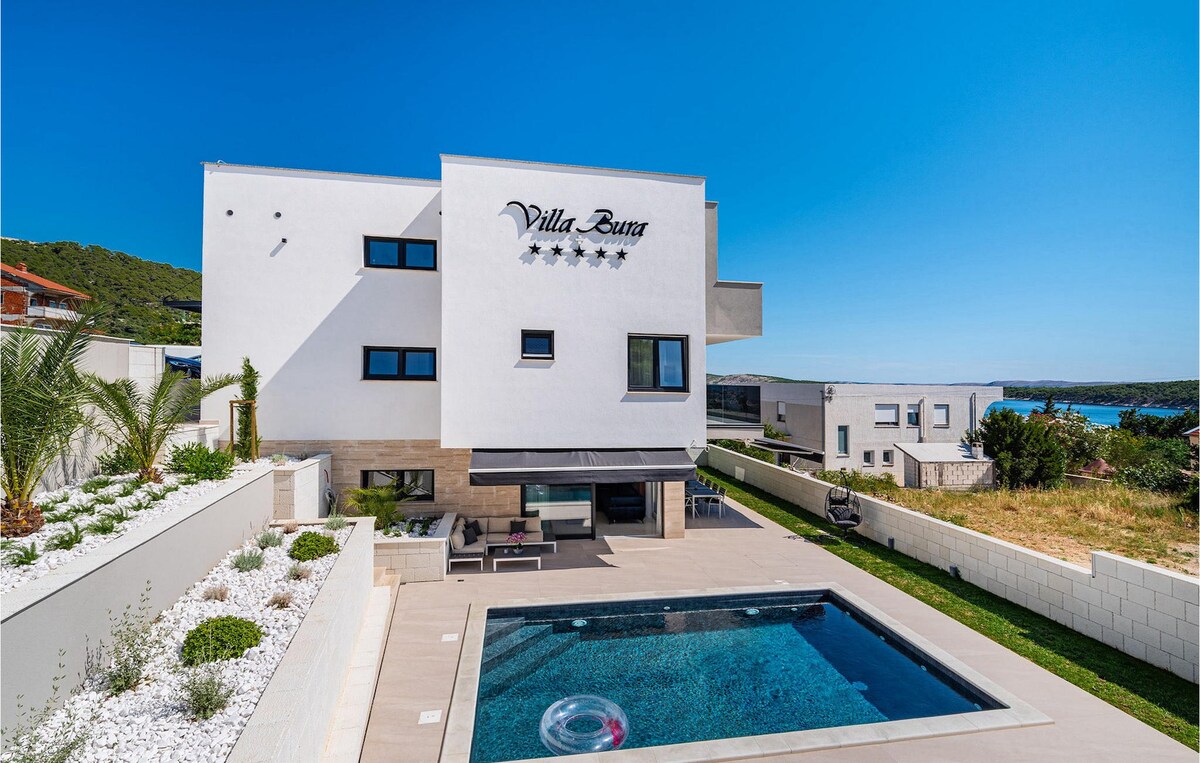 The eco-friendly 4-star Croatia Heaven villa on Pag accommodates up to 7 guests across 100 m². This modern, ground-level, non-smoking villa features a terrace and private pool with sea views. It offers a sauna, three bedrooms, two bathrooms, a WC, linens, towels, fast Wi-Fi, and a fully equipped kitchen. The villa is allergy-friendly and cleaned with eco-friendly products. An electric vehicle charging station is also available – perfect for a sustainable getaway. (Pool usage: May- early October)