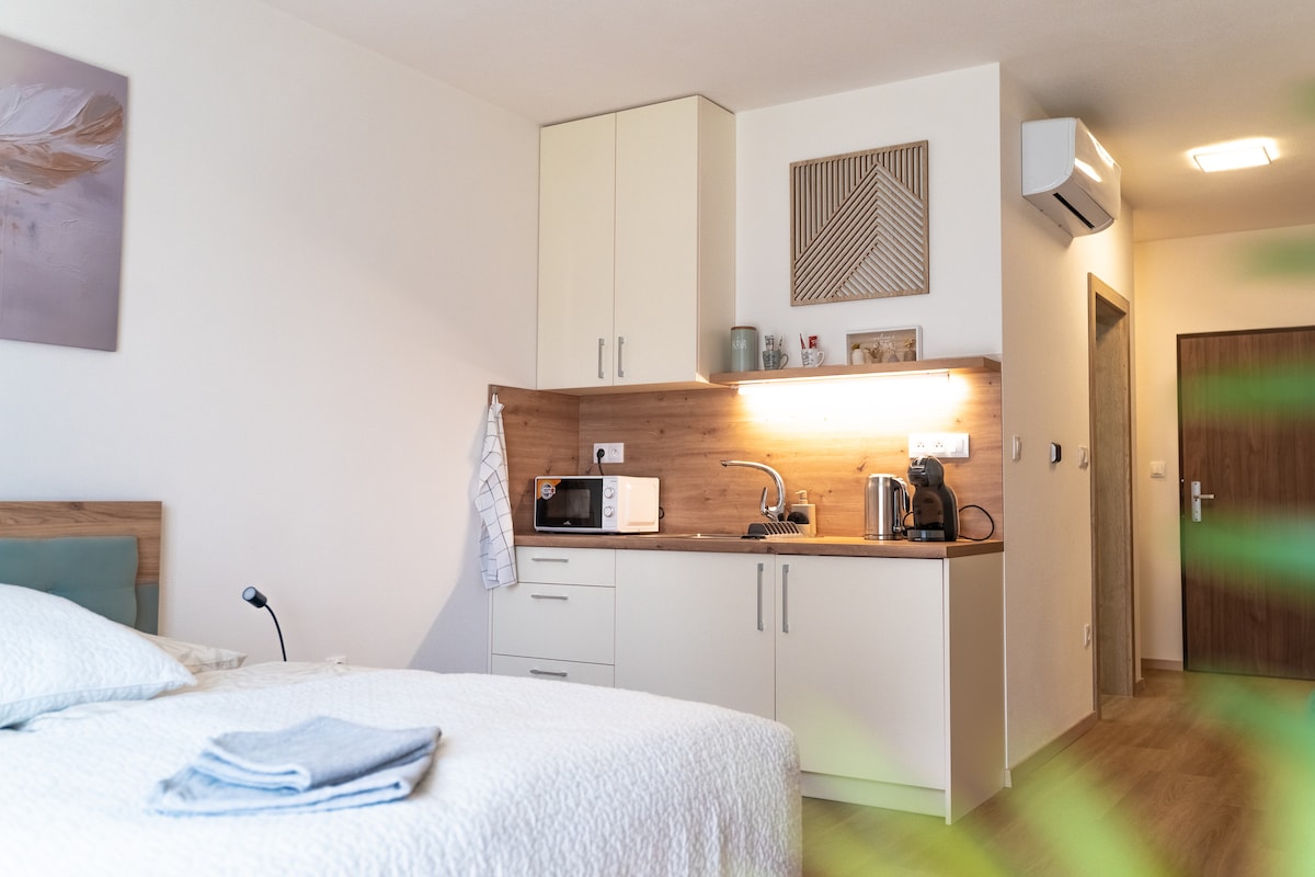 Zrekonštruované štúdio sa nachádza v centre mesta v budove na treťom poschodí v podkroví. Štúdio je zariadené tak, aby bola oddelená nočná časť od dennej. Súčasťou štúdia je samostatná kúpeľňa s toaletou. Kuchyňa je vybavená vstavanou chladničkou, indukčnou prenosnou varnou doskou a základným riadom. V kúpeľni sú hosťom k dispozícii uteráky a osušky. V cene ubytovania je aj posteľné prádlo. Do centra sa dostanete peši za 3 minúty. V štúdiu, ako aj v celej budove, je zákaz fajčenia.