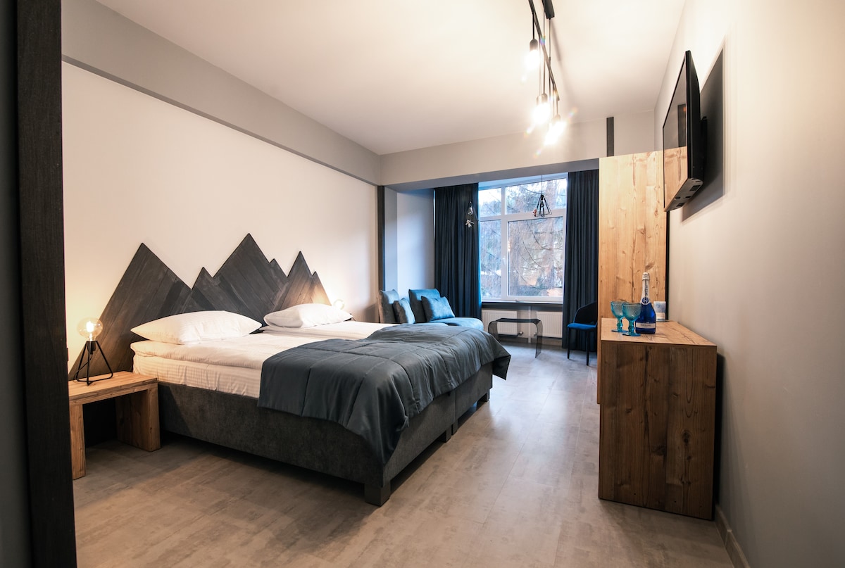 4 star modern hotel with a rating of 9.9. Modern rooms are equipped with double beds, a flat-screen TV and everything you need for a comfortable stay. The rooms have a bathroom with a shower cabin, toilet, hairdryer and toiletries. There is a parking lot, a ski storage room, a restaurant and a spa complex on the premises. The presence of 2 heated swimming pools, that is, in any weather you can relax coolly. Breakfasts are included in the room rate.