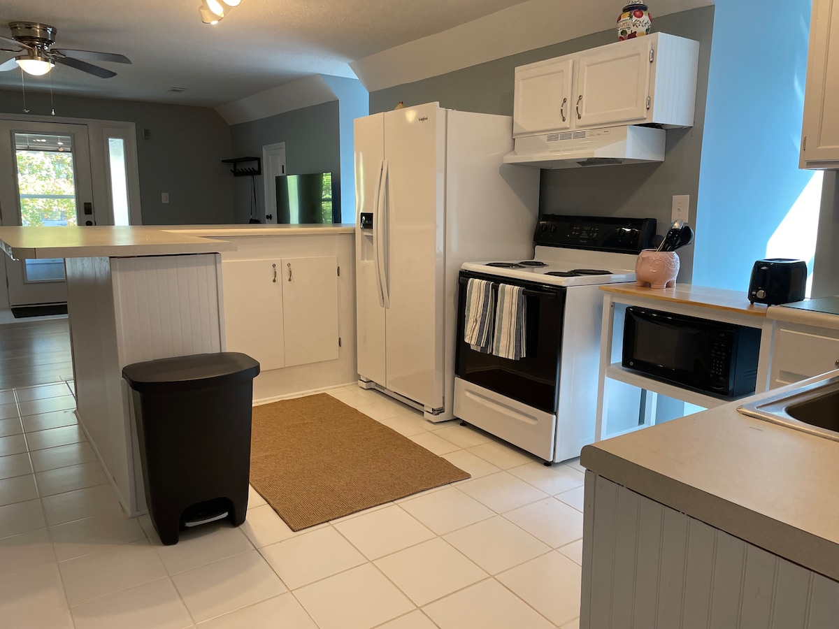 Welcome to our home! Come stay in our quiet and serene suite, complete with its own private entrance. Cook delicious meals in a real kitchen with full size fridge, stove, & microwave (coffeemaker & toaster too). Sleep well on the adjustable memory foam queen bed. Relax on the sofa and enjoy various streaming services. Get some work done at the desk with the included wifi. Have a friend stay on the queen sleeper sofa. This is our home. You may see or hear our family & dogs around the property.