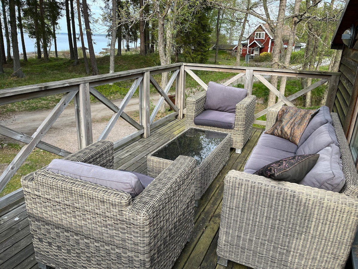 Newly-built cottage right by the sea with a large jetty and a private berth. The dock is made for you to enjoy all day, as there are sun loungers, swimming ladder, outdoor furniture and barbecue. Within walking distance, you can rent kayaks, paddle tennis courts and a spa. The cottage has an open living room and kitchen with stunning views of the sea. Toilet with shower and washing machine. Upstairs, there are 3 bedrooms. One with a double bed and a private balcony, one with 2 single beds that can be put together and one with a 120 cm bed.