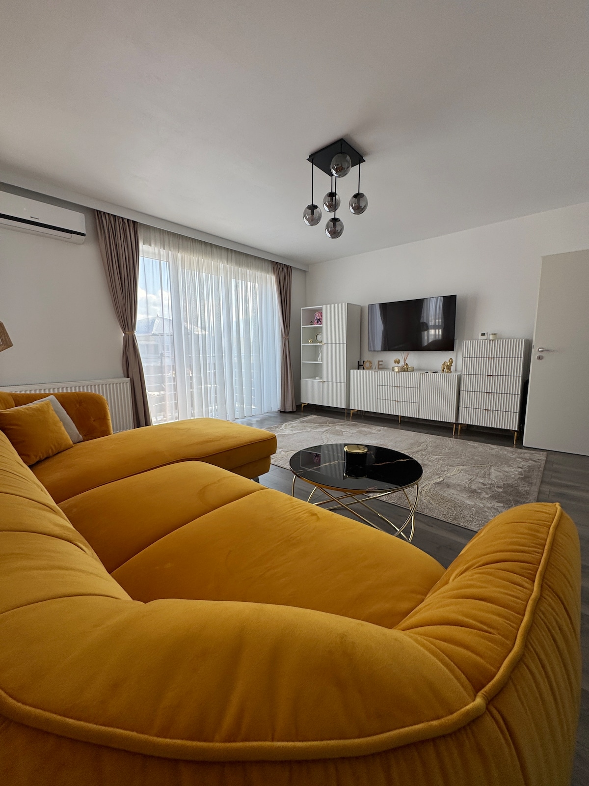 Confort Modern & Design Cald în Inima Brașovului Bine ai venit în refugiu tău elegant din Brașov — un apartament luminos și modern, creat pentru confort și relaxare. Spațiul dispune de un living generos cu șemineu electric, un Smart TV de ultimă generație și o canapea mare, galben-muștar, care adaugă o notă de rafinament și căldură.