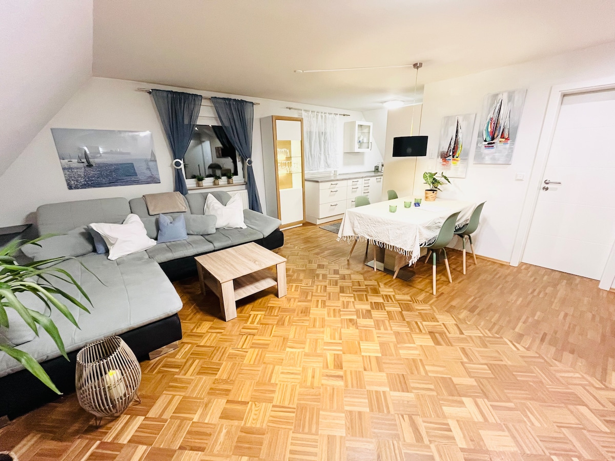 Cozy and Central Apartment in Ravensburg – Ideal for Vacation & Business Trips This attractive property is a modern ground-floor apartment with 80 m² of living space, featuring a luxurious interior design. The amenities include a spacious living and dining area, two bedrooms, a bathroom, and a guest WC. The apartment features natural wooden floors with underfloor heating throughout.