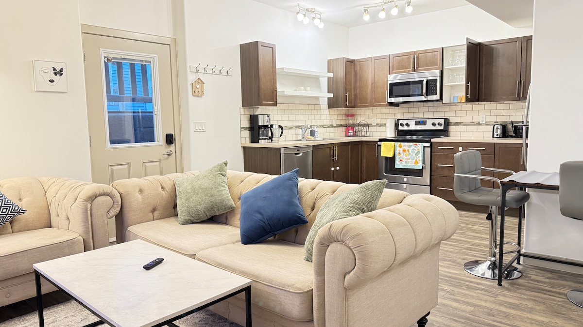 KING SUITE***Cozy 1-bedroom king suite- completely separate entrance, new build construction with private yard and cement patio, off-street parking with a plug-in for winter season. Features a king bed w/blackout blinds & queen sofa bed with luxury duvet beddings, full kitchen and washer/dryer. Enjoy in-floor heating throughout and 9-foot ceilings, creating a bright comfortable space perfect for privacy and relaxation. **** some days there is potential for noise transfer from the main dwelling