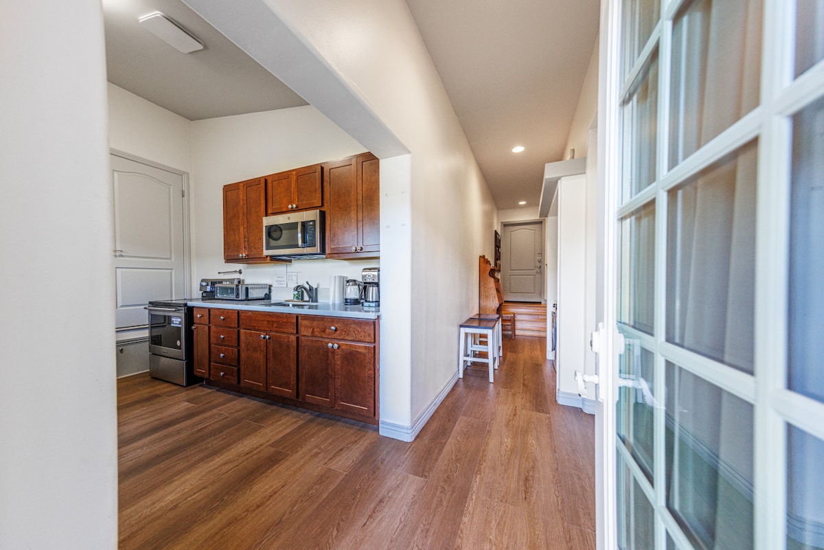 This is a comfy little studio attached to the main front property. You would have complete privacy with a private entrance and self-check in. The studio has a standard queen size bed (60x80in), bathroom, closet space, small dining table & a desk/office space. There is not a full kitchen, but the room has a mini fridge, microwave & k-cap machine. -Good for business travelers & solo adventurers -Free parking available on the premises