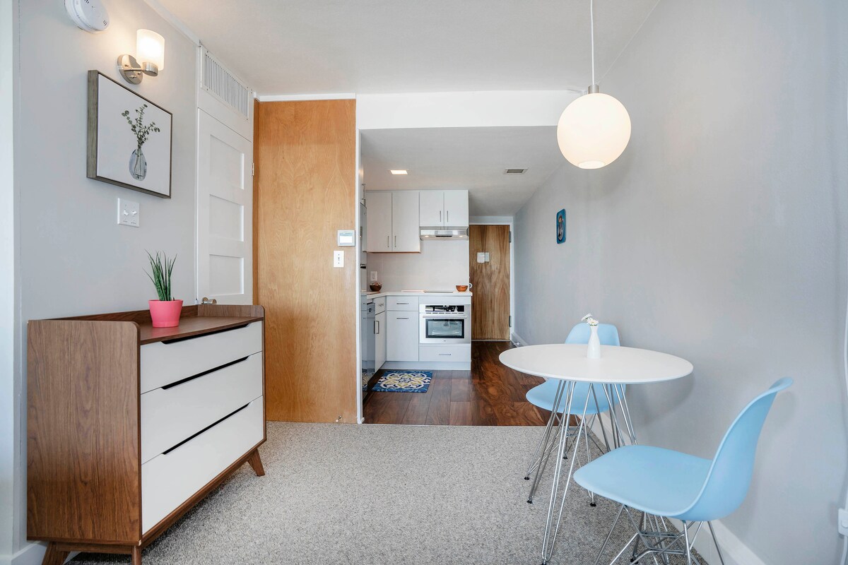 West coast style meets the Atlantic in this renovated ('22, '23) second floor condo on a quiet street, just half a block from the bustling shopping, dining, and nightlife of Rehoboth Avenue, and just 4 blocks from the beach. Modern comfort features include quiet central air conditioning, 75" 4K streaming TV, fully equipped kitchen, and custom closets. Includes use of 2 cruiser bikes, 1 reserved on-site parking spot, and 1 pass for non-metered street parking in town.