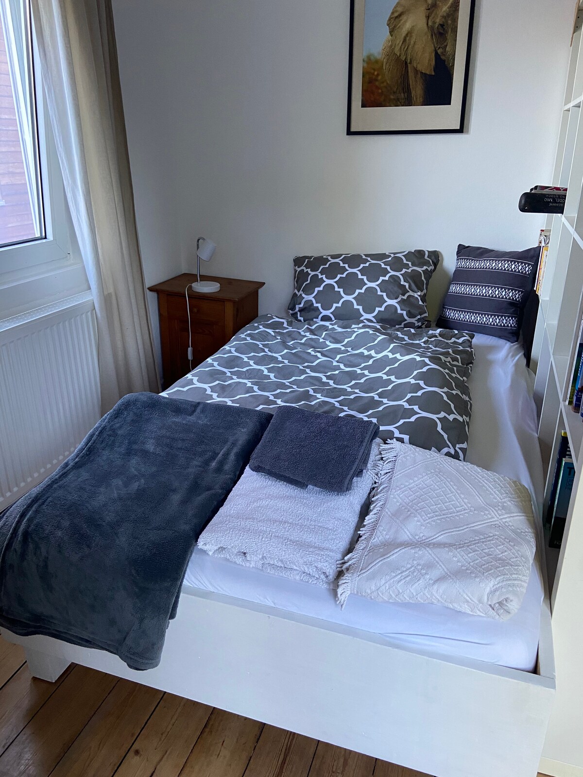 The room with integrated kitchenette and separate shower room/toilet has its own entrance and is accessible. It is located in a two-family home. The kitchen is equipped with basic cooking equipment and a refrigerator. Wardrobe, chest of drawers, a table and two chairs, a double bed. Wi-Fi is available.