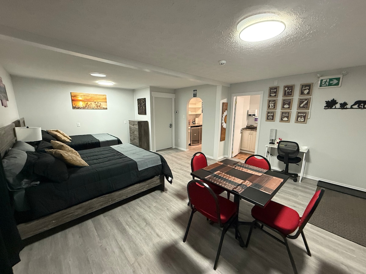 In this ideal location resides a triplex with a gorgeous and well-lit, clean and fully equipped, 2 queen bedroom basement unit. The kitchen is stocked: a few K-Cups for a good start, dishwasher, fresh towels and traveler sized toiletries in the case you forgot :) Laundry/storage room with washer/dryer, TV’s in both beds, unlimited Wi-Fi and ample parking. OFSC trails less than 1min away, Golf Course is a 600m walk and the corner stores nearby are less than 1km. Come enjoy the great outdoors!