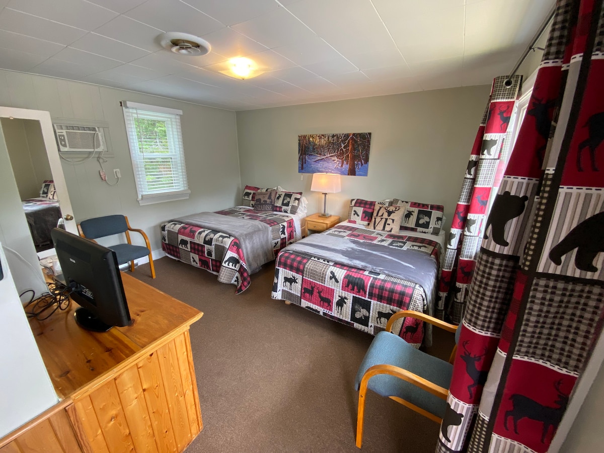 This waterfront unit features a private patio and was newly renovated in spring 2025! Room Two is a one-bedroom unit with a two double beds, an accessible 3-piece luxury bathroom, and a kitchen with a full-size fridge, stovetop, microwave, coffee maker, and air conditioning. Enjoy a TV with satellite service, free Wi-Fi, and complimentary use of the picnic area and fire pit by the beautiful Madawaska River.