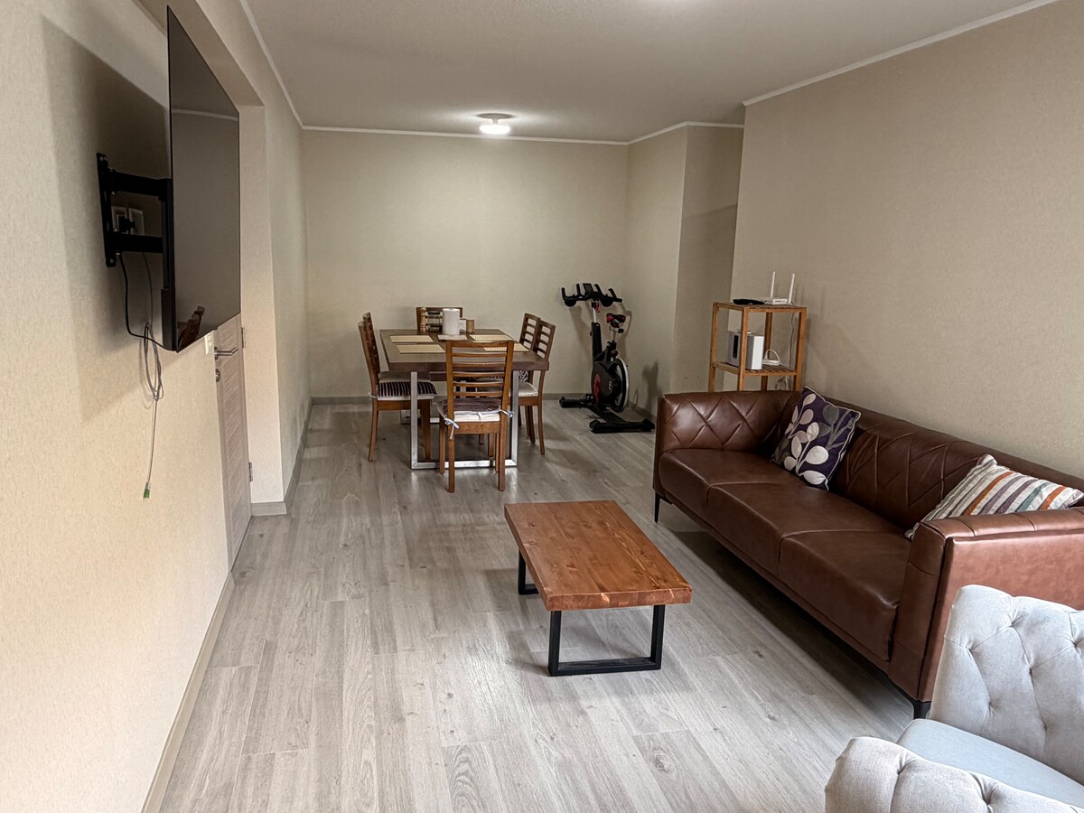 Acogedor departamento monoambiente ideal para una estadía cómoda y tranquila. Cuenta con cama Queen, Smart TV de 55”, WiFi de alta velocidad y sillón para descansar. Cocina equipada con refrigeradora y utensilios básicos, además de baño completo y therma para agua caliente. Un espacio moderno, limpio y funcional, perfecto para viajes de trabajo o descanso, pensado para que te sientas como en casa.