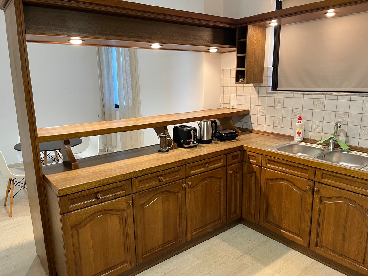 It is a 85sqm apartrment with remarkable view and morden design in a envirenment where the only noise is the birds of the forest. We would like to inform you that our apartment DOES NOT HAVE AIR CONDITIONERS and ener efficient appliances. There is car parking at 10 meter away. In 15 minutes walk you are in the lidl super market and there is a mini market at 300 meter away.Also the famous caffe koukouvaya is at 10 minutes on foot.q