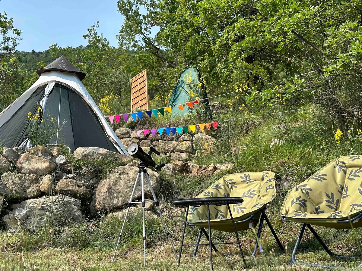 At the foot of the cliffs of Roussillon, in the heart of the Luberon, you will discover our Tipi. Welcome to La Tribu des Ocres. With us, you can forget your car... the village is only a 5-minute walk away, so you will be both in a natural setting and close to all amenities. Enjoy the harmonious singing of birds and cicadas as soon as you wake up.