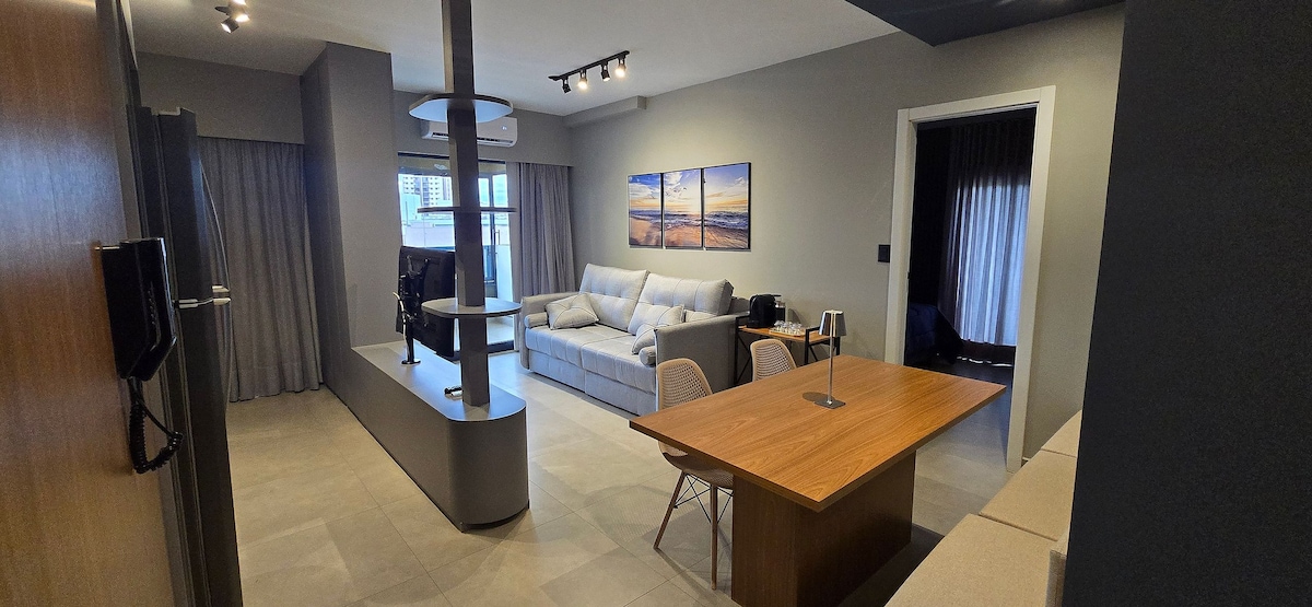 Espaçoso e agradável, com ambientes climatizados com ar condicionado nos dois quartos e sala. É decorado e equipado, com todo necessario para receber bem 4 pessoas. Cozinha totalmente equipada! Estamos localizado no melhor bairro da cidade, próximo a shopings, bares, parques, supermercados, restaurantes e td o que vc precisa. Possuímos uma cama queen size na suíte e 2 camas de solteiro queen no segundo quarto. Com 1 vaga de garagem coberta. Condomínio seguro com portaria 24 hrs.