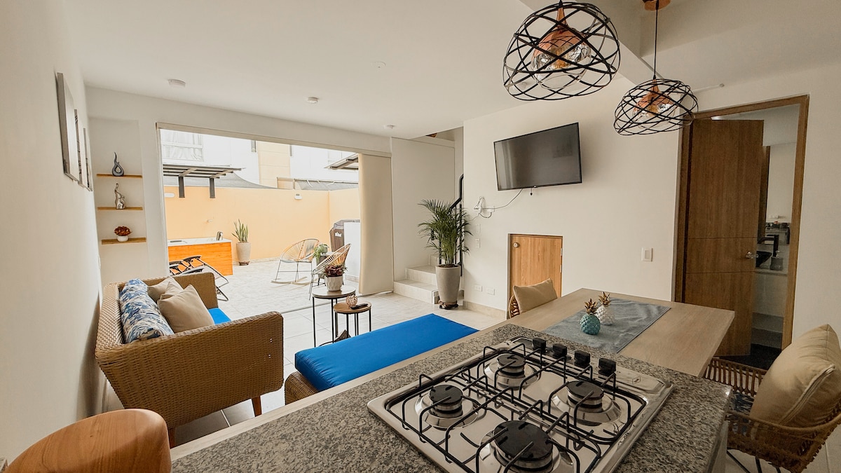 Disfruta una casa NUEVA y moderna en un exclusivo condominio de Ricaurte. Jacuzzi privado, espacios amplios y el descanso perfecto para familias y grupos hasta de 10 personas. Jacuzzi privado 24/7 Piscina para niños en el condominio 2 habitaciones con aire acondicionado 2 baños privados Cocina equipada + zona BBQ Zona social con aire acondicionado WiFi, TV y parqueadero privado Seguridad 24/7 y excelente ubicación Estamos en el 5% de alojamientos mejor valorados en Airbnb