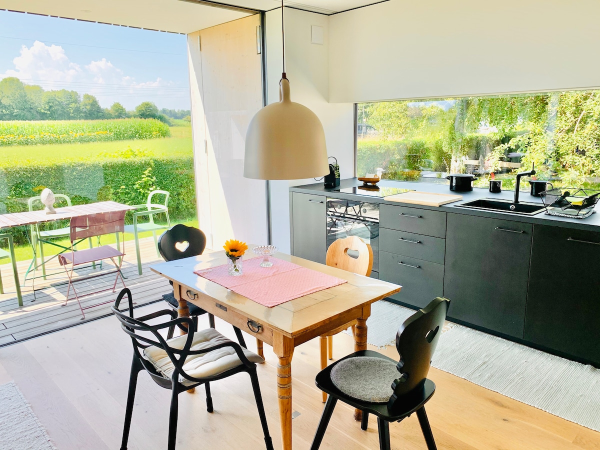 Our guesthouse is absolutely quiet and secluded on the outskirts of Törwang with unobstructed views of the Hochries and the Inn Valley. In the summer of 2020, 2 low-energy wooden houses made of local woods were built completely pollutant-free. A place to let go and breathe deeply. With its own garden and southwest terrace. The vacation home has a large living room with a carpenter kitchen, dining table and sofa bed with a spring core mattress (200 x 160 cm) and a bedroom & bathroom with a shower.