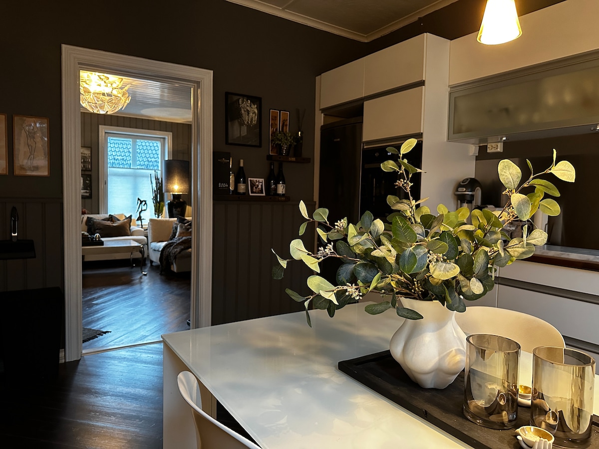 Welcome to Lillehammer's perhaps most stately house with apartment over three floors. Newly renovated in 2020 in one of Lillehammer's oldest farm buildings dating back to 1659. From the balcony you have an amazing view over Mjøsa and the apartment has sun from sunrise to sunset. In the apartment there is a new large kitchen, dining room with table space for 8 and a large living room with a nice sofa and large TV, bathroom and guest room. On the top floor there is a large bedroom with French balcony and a super view.