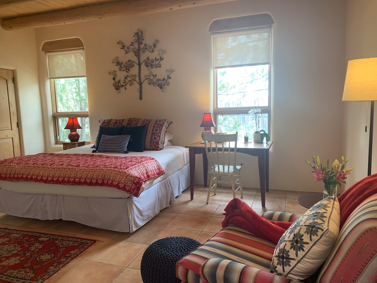 This beautiful space w/ queen and twin day beds, avail monthly+, is one block from the heart of Taos but secluded and quiet. The room is behind my 1938 historic home sharing a courtyard and ample parking space. It is 300 sq ft with hardwood floors, adobe walls, and full bath. It is equipped with a kitchenette. There is a shared patio space and grill. The yard is fenced. From this downtown location you can walk to restaurants, museums, theater, galleries, and shopping.