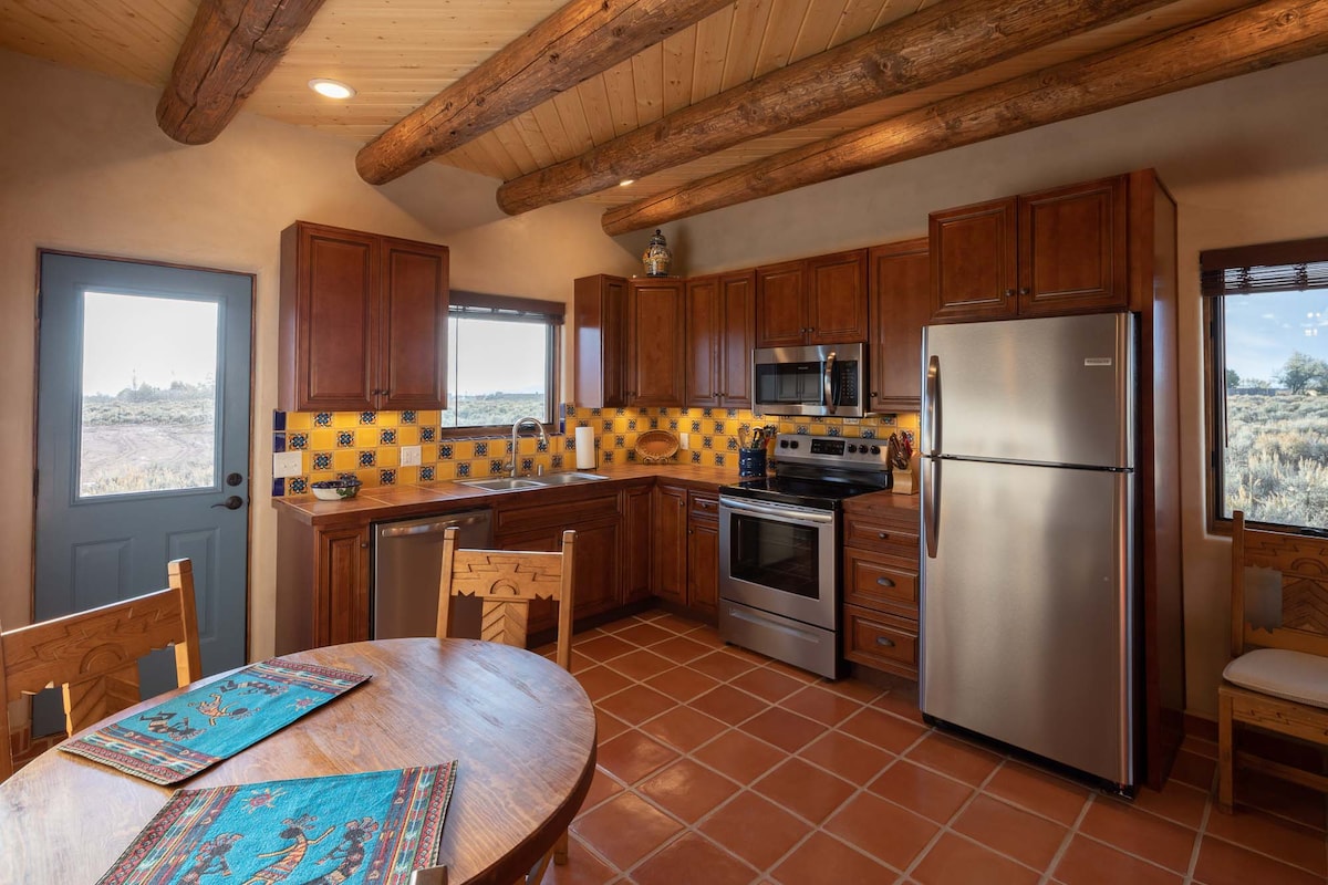 The best views in Taos--mountains all around. A truly private and impossibly romantic getaway. Traditional adobe casita with vigas and latillas, on a paved road, at the edge of the mesa overlooking town. Only three miles to the Plaza, easy access to Taos Ski Valley, the Rio Grande Gorge, Ranchos, and the road to Santa Fe. Speedy fiber optic internet for digital nomads. Sunrises and sunsets are spectacular. We offer a great experience--just look at all the wonderful reviews by our awesome guests!