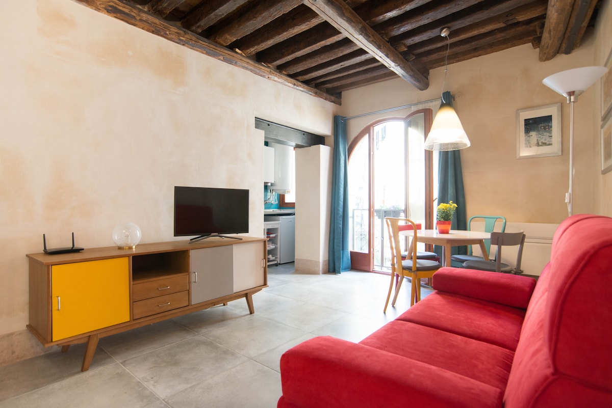 House with beautiful canal and church view, the result of a recent and careful restoration maintaining the original characteristics, Venetian terrazzo floor, modern and comfortable furnishings, flooded with light and sun. In a lively neighborhood in the historic center, a few minutes' walk from two vaporetto stops, near the Grand Canal, Rialto, museums, supermarkets, pharmacies, typical taverns. Access with personalized code, underfloor heating, air conditioning, Wi-Fi. Sanitized house!