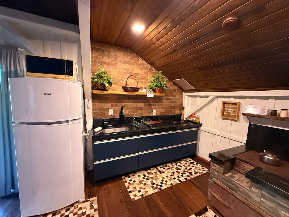 The Una chalet at @chalespanini has: Fully equipped kitchen, microwave, electric oven, blender. We also offer essential items such as salt, sugar, coffee, and detergent. The bed is super comfortable with quality bed and bath linens. The fireplace provides a pleasant atmosphere on cold days. We offer firewood for the stay. Hot tub for couples, with bath salts. Gas-heated shower and faucets with a beautiful view of nature.