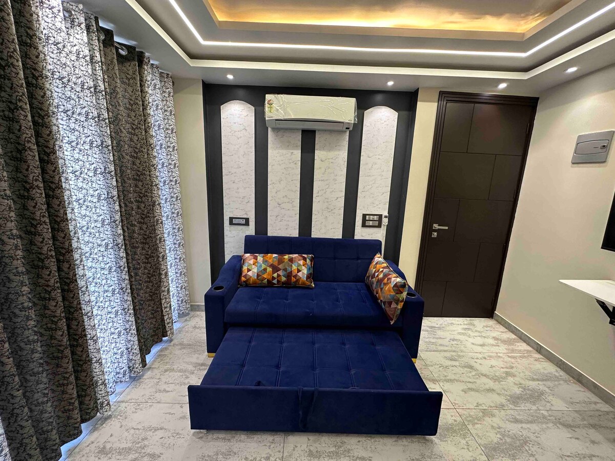 Welcome to your stylish and comfortable home away from home. This modern 1BHK apartment features a beautifully designed living area with a smart TV, AC room, Kitchen with full Accessories , cozy sofa seating, Cafe style seating Area , and warm ambient décor for a relaxing stay. • Located about 300 meter from Nim Beach, Nearby Laxman jhula , Bajrang Setu Tapovan . • Perfect for couples, solo travelers, or work-from-anywhere guests.