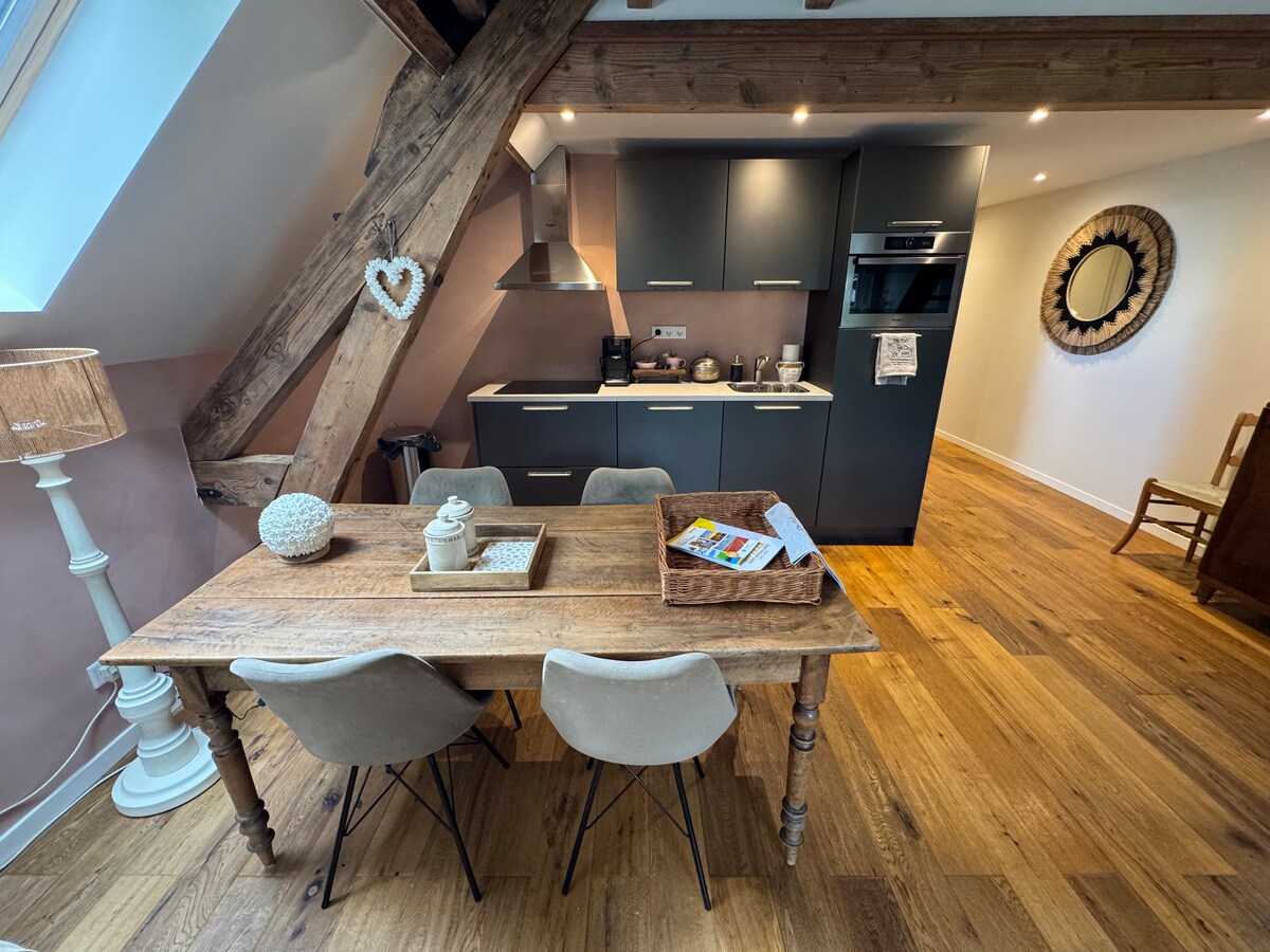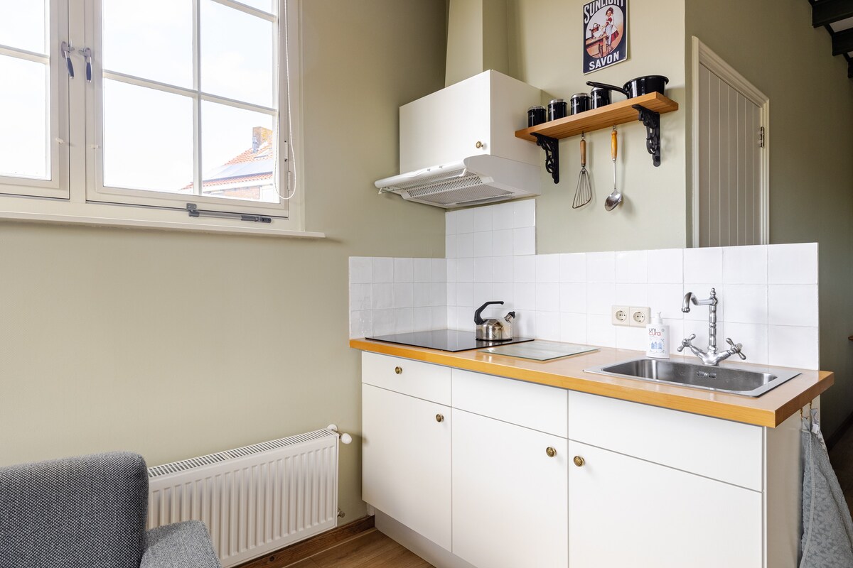 A special apartment with a mix of cool details and beautiful styling in the center of the picturesque Groede. The cozy sitting area and dining area are adjacent to a well-equipped kitchen with a large stove, dishwasher and other appliances. You can sleep in the cozy stylish bedroom with old details where the bathroom with rain shower is adjacent or on the loft where bedroom 2 is located.
