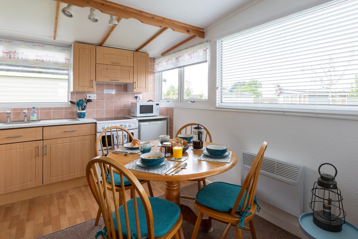 Comfortable 2 bed chalet to sleep 4 people. Sofa comfortable and long enough for 1 extra adult ( by separate arrangement) BED LINEN PROVIDED FOR THE DOUBLE AND SINGLE BEDS, TEA TOWEL, OVEN GLOVE AND BATHMAT. * Please bring your own towels, or order from the laundry for £8 per bundle * Electricity is metered. Please bring a supply of £1 coins. Cost obviously is more in the winter than the summer. Current summer price around £2-3 a day, winter £4-5 a day when using all the heaters.