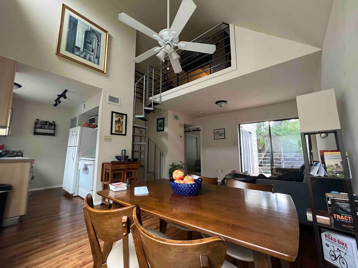 Come stay in my lofted condo! Ten minutes from downtown, ten minutes from south Congress, walking distance to the lady bird lake trail, this condo is close to everything. You’re right next to great food trucks and restaurants. The condo has a queen bed in the master bedroom, a full sized pullout in the loft, and a couch, sleeping a total of 5. Please read before booking - 1. The loft counts as one of the beds in the listing. 2. The TV is in the loft. 3. You’ll check in via smart lock code
